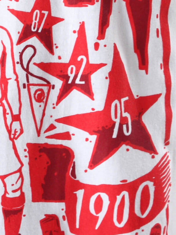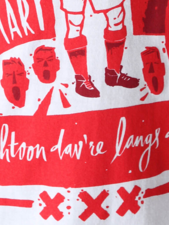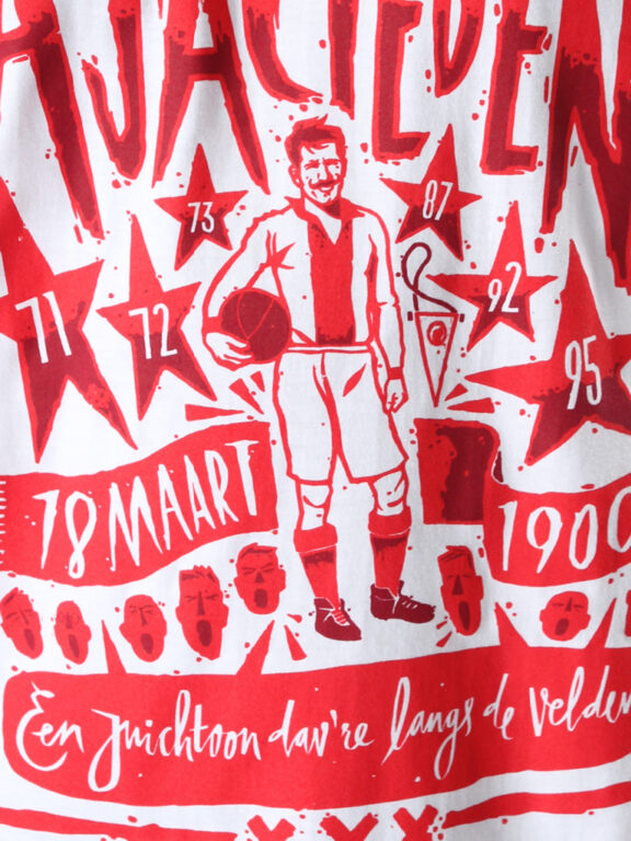 A shirt for Ajacieden aka supporters of the most successful club in the Netherlands. Research in 2010 shows that in Europe live about 7.100.000 Ajacieden. In the Netherlands about 39% of the football supporters sees him- of herself as a “Ajacied”. Thats well worth a proper tee! The tee design comes on a loose fit white shirt with the date of birth, all memorable years, the first line of the clubsong and 3 Andreas Crosses representing the capital of the Netherlands (Amsterdam). All elements stylish composed into a piece of art by Spanish illustrator Jorge Lawerta, who published in several leading magazines about football culture.
