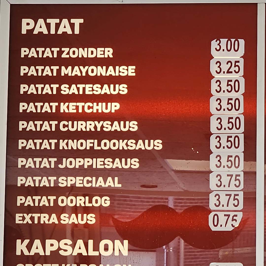 ✅ Patat ✅ Friet ✅ Softijs ✅ Broodje Bal ✅ Nasibal ✅ Berenhap ✅ Kaassoufflé ✅ Kipkorn ✅ Gehaktbal ✅ Hamburger ✅ Frikandel ✅ Cheesburger ✅ Bamischijf ✅ Bitterbal ✅ Viandel